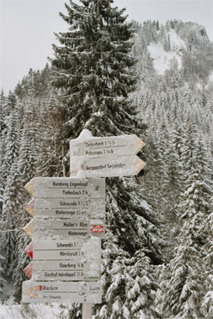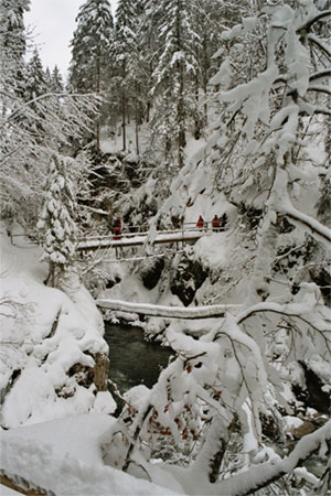 | Durch die Enge führt uns der Weg hinunter an die Breitach. Ein kurzer Abstecher zum Gasthaus Waldhaus sollte mit eingeplant werden. Ansonsten der Beschilderung folgend Richtung Walserschanze / Breitachklamm laufen. Wir haben uns für den Apfelstrudel entschlossen. Nach dem wir die Schneeschuhe abgeschnallt hatten sind wir erst nach re. ins Gasthaus Waldhaus abgebogen. | |