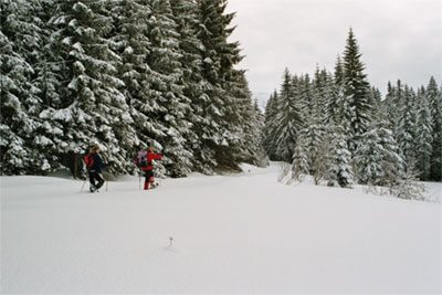Kurz hinter der Sesselalpe haben wir die Schneeschuhe angezogen und sind langsam ansteigend durch den tief verschneiten Winterwald gestapft.